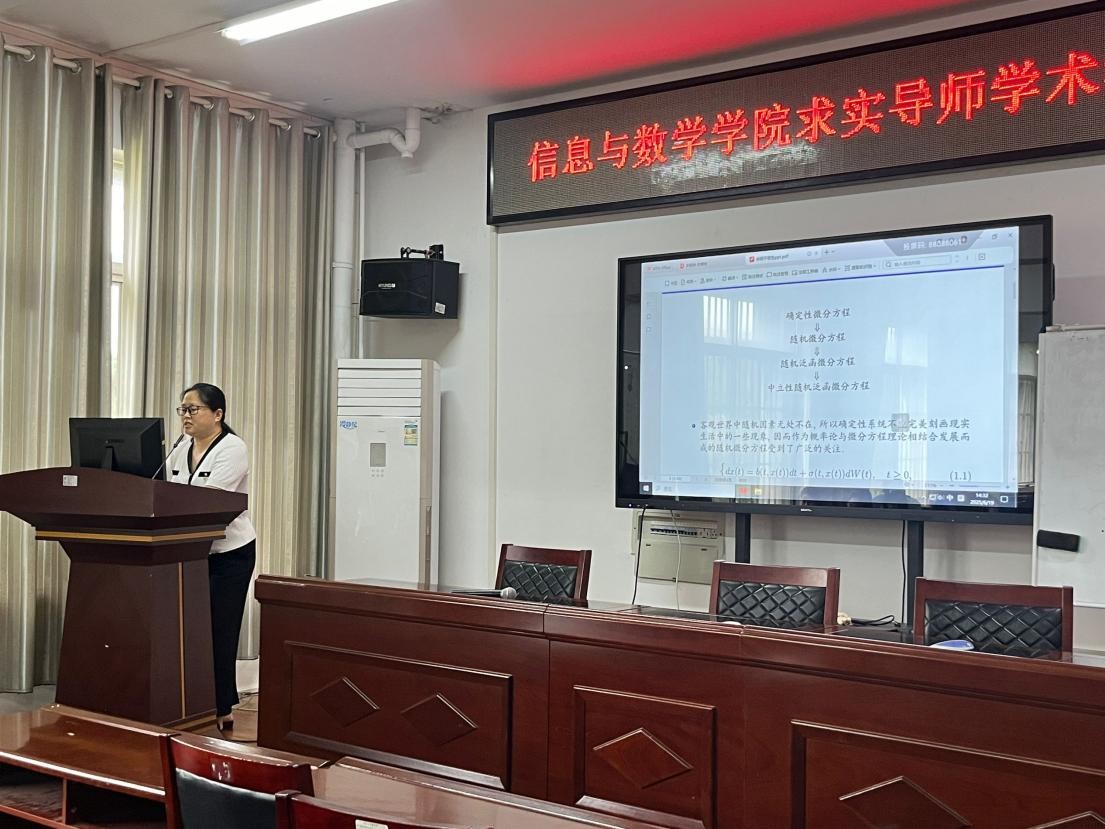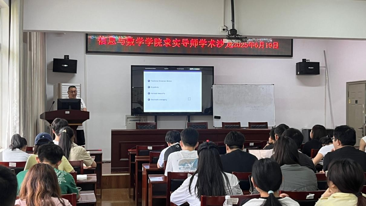 活动开场,李治老师以“分数布朗运动及相关问题”为主题,系统阐释了这一非经典随机过程的核心性质。他首先解析分数布朗运动的自相似性、长记忆性等独特特征,继而对比传统布朗运动与分数布朗运动在随机积分理论上的差异,重点介绍了Young积分、Russo-Vallois 积分等适用于分数布朗运动的积分方法。在随机微分方程研究方面,李老师围绕解的遍历性、Harnack 不等式等核心问题展开分析,揭示了分数布朗运动驱动下系统的长时间行为规律。他特别提及团队在非合流随机微分方程理论中的突破——通过构造新型Lyapunov函数,证明了方程解的轨道唯一性与遍历测度的存在性,为金融数学、物理建模等领域提供了关键理论支撑。