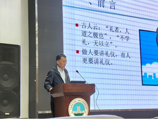(通讯员 胡珮)为增强同学们的人文学科素养,规范行为,塑造良好形象,促进和谐,以及提升同学们对文化-文明的见解和认知。公司于11月15日下午四点在农科大楼1058报告厅开展“抗大·树梁”文化-文明礼仪培训。公司党委书记李喜成、院团委书记黄何、辅导员吴朝晖、张定国老师以及全体大一新生共同参加此次会议,本次培训会由公司党委书记李喜成作专题报告。