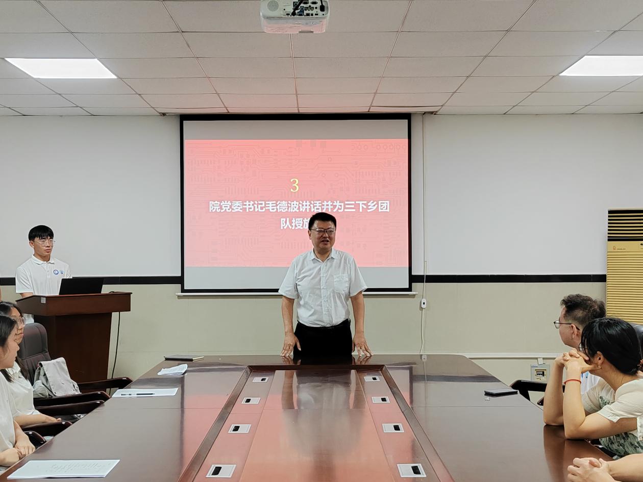 公司党委书记毛德波发表讲话。他深刻阐述了暑期社会实践的重要意义,鼓励同学们将专业知识与实践相结合,在服务社会的过程中传播先进文化,不断提升综合素养。讲话结束后,毛德波书记亲自为“三下乡”团队授旗,鲜艳的旗帜在会场中格外醒目,象征着沉甸甸的责任与光荣的使命,接过旗帜的瞬间,队员们心中的使命感油然而生。
