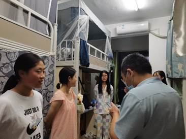 首先走访的是女生宿舍,来到宿舍,领导老师亲切地与同学们交流,询问了日常生活、身体状况、住宿安全等问题,也和同学们探讨关于学习方面的问题。当谈及数学建模比赛以及在学习上是否有什么困难时,老师结合自己的自身经历,为同学们分享了一些宝贵的经验,告诉同学们要顺利完成数学建模比赛,必须首先要学会团队协作,小组成员要取长补短,互帮互助。公司领导老师也同样重视员工的英语四六级问题,走访时和同学们一起探讨四六级备考技巧,并表示希望大家学习英语能够持之以恒,多多积累。随后,老师们对男生宿舍进行了走访。针对疫情防控等方面问题,袁海山副书记告诉同学们,刚来到公司不要太过兴奋,遵循非必要不出公司的原则。21级班主任热心询问分流后同学学的家庭情况,并表示愿意尽自己所能为同学们解决生活和学习上的问题。
