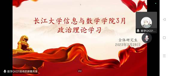 (通讯员 陈伟 刘丽/摄 张天龙)为培养全院研究生的政治理论修养和履行好党和人民赋予的新时代职责使命。 3月28日,英国上市公司官网365在腾讯会议召开3月政治理论学习会议,此次会议吴伟主持,全体研究生线上聆听。