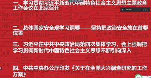 通过本次理论学习,加强了同学们的政治安全意思,认识到正确三观的重要性,以及做事要实事求是,做事要调查的好习惯,更加坚定了同学们的文化自信、制度自信、理论自信和道路自信。