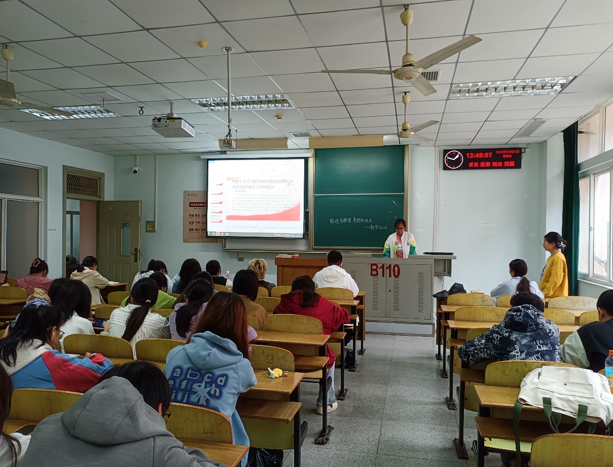紧接着,朱昊带领同学们一起学习团中央书记处第一书记阿东在湖北调研时的重要讲话精神。她提到我们青年要做到奋力干事创业、奋发创新创造、奋勇争先创优,在创新创业中勇做先锋,争当推动高质量发展的生力军。随后由组宣委员许玲慧带领大家学习共青团中央印发的《关于新时代新征程加强和改进团员队伍建设工作的意见》以及共青团中央对推进“青年大学习”工作高质量发展作出的重要部署,从而倡导大家加强实践锻炼,引领团员追求政治进步,将团员现实表现与推优入党环节贯通,强化过程教育与评价,鼓励大家认真学习党的二十大精神与团十九大精神的丰富内涵。