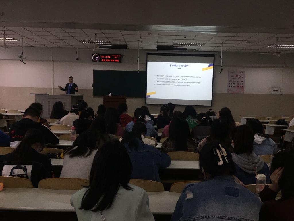 随后,袁锵就目前就业形势进行了详细的分析。他指出,在就业高压下,考研考公比率逐年增加,就业形势严峻。他表示,大四毕业生应该提早做好规划,提高“搜商”能力,不负期望,他指出选择比努力更重要!现场爆发出热烈的掌声。