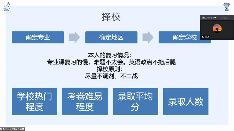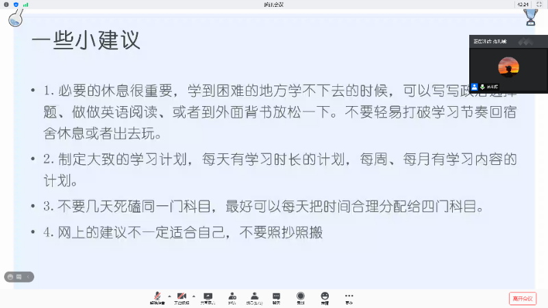 随后,范礼媛同学就择校方面补充道:要从各方面了解考研公司的热度,根据自己的强项去选择不同公司。她在英语备考及政治备考两方面做了详细介绍,表示这两门科目都要尽早的去背诵记忆。最后,会议在严星老师与两位主讲人给同学们答疑解惑中落下帷幕。