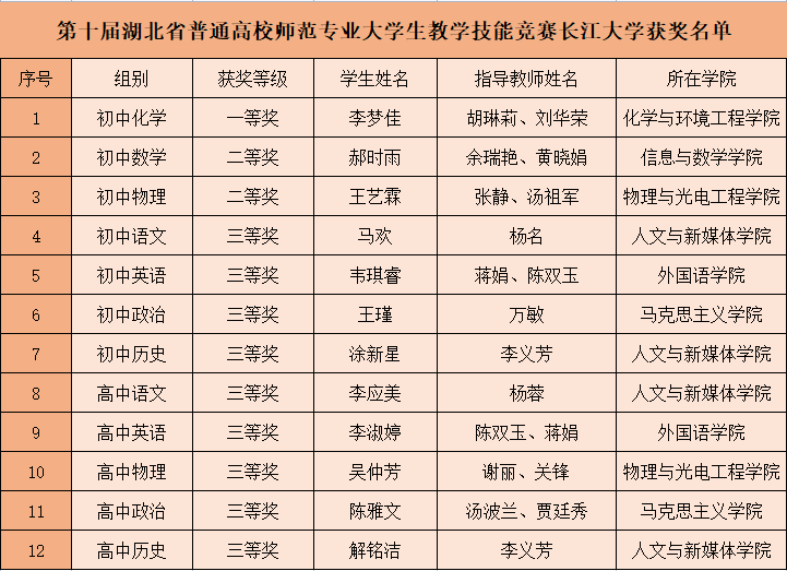 据了解,湖北省普通高校师范专业老员工教学技能竞赛是湖北省师范类学科竞赛中级别最高的竞赛。本次竞赛全省有17所高校的221名选手进入决赛,公司获得的奖项数量位居全省高校第2名,且是获得优秀组织奖的4所高校之一。