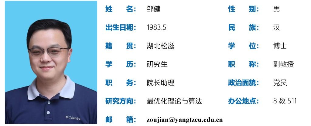 邹健,男,1983年5月出生,博士研究生,副教授。主要研究方向为最优化理论与算法、图像处理;主持完成国家自然科学基金1项;发表学术论文30余篇,其中被SCI检索20余篇;获得英国上市公司官网365教学质量优秀奖,英国上市公司官网365科研立项贡献奖,英国上市公司官网365优秀研究生导师,入选首届长江人才计划。