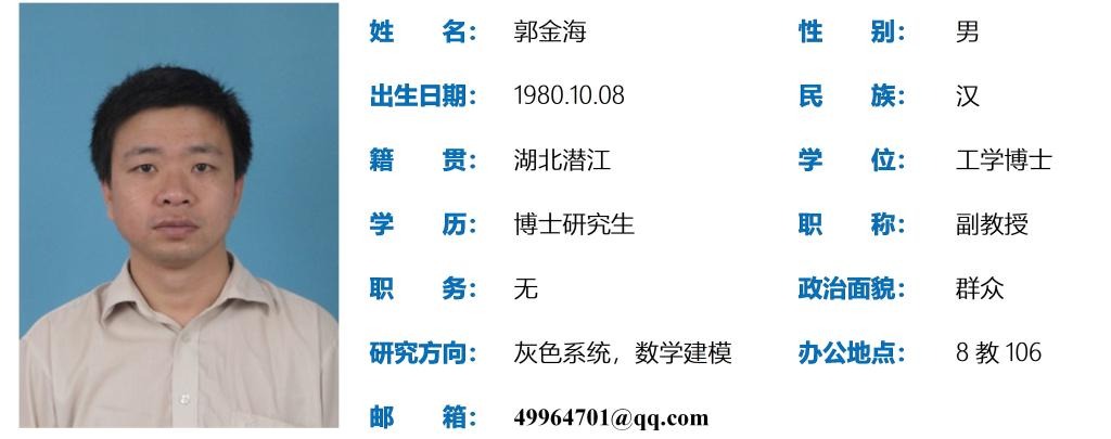 郭金海,男, 1980年10月出生,博士研究生,副教授。2016年12月毕业于武汉理工大学一般力学与力学基础专业,获博士学位,主要研究方向为灰色系统理论及其应用和数学建模。一直从事老员工数学建模和数学竞赛的指导工作,指导员工获多项国家奖和省奖,获得“全国老员工数学建模竞赛湖北省优秀指导教师”。荣获“教学质量优秀奖”和“员工最喜爱的老师”。参与国家自然科学基金项目3项、省部级科研项目2项,共发表学术论文16篇,其中被SCI检索收录5篇,EI收录6篇。