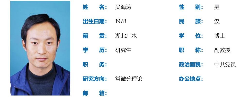 吴海涛,男,1978年10月出生,博士研究生,副教授。主要研究方向为常微分方程理论;发表学术论文7篇;主编教材一本。