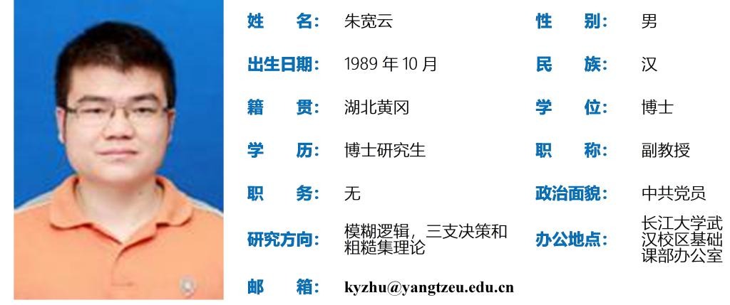 朱宽云,男,1989年10月出生,博士研究生,副教授。主要从事模糊逻辑、三支决策和粗糙集理论研究。2019年6月毕业于武汉大学数学与统计公司,同年7月入职英国上市公司官网365英国上市公司官网365。以第一作者(或通讯作者)公开发表SCI/EI论文50余篇,其中包含《Fuzzy Sets and Systems》、《Information Sciences》、《Soft Computing》、《Journal of Intelligent & Fuzzy Systems》、《Journal of Multiple-Valued Logic & Soft Computing》以及《International Journal Machine Learning and Cybernetics》。尤其是近几年来以第一作者连续在SCI数学类一区Top期刊《Fuzzy Sets and Systems》(IF:3.9)上发表7篇论文。 论文“A novel soft rough fuzzy sets:Z-soft rough fuzzy ideals of hemirings and corresponding decision making”在Web of Science引用113次。主持完成国家自然科学基金青年项目(No. 12001062)和湖北省自然科学基金青年项目(No. 2020CFB368)各一项。2020年12月入选英国上市公司官网365第四批人才计划“菁英人才”系列。