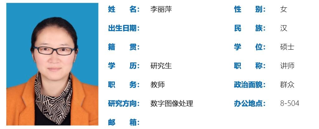 李丽萍 女 硕士研究生学历 本科毕业于中国地质大学(武汉)数学与应用数学专业,硕士研究方向为“数字图像处理”与“数学课程教法研究”。2017年9月–2018年7月在武汉大学科研访学的同时对武汉大学的本科教学和教法进行了学习。发表学术论文多篇,参与国家专利发明一项。