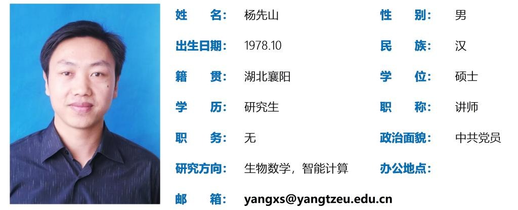杨先山,男,1978年10月出生,硕士研究生,讲师。主要研究方向为生物数学;参与国家自科基金面上项目1项;发表学术论文10余篇,其中SCI收录3篇;编写教材2部;多次获得“教学质量优秀奖”等奖励。
