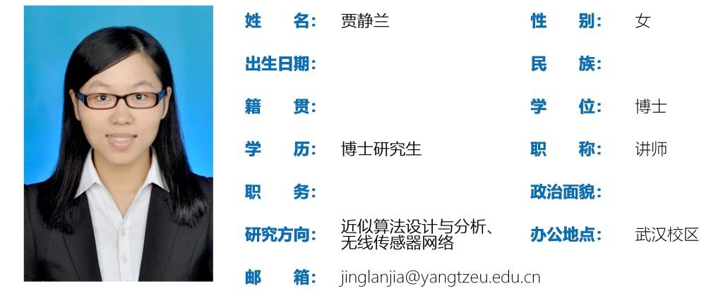 贾静兰,女,博士,讲师,主要研究方向为近似算法设计与分析、无线传感器网络。主持湖北省教育厅科学技术研究计划指导性项目1项;发表学术论文5篇;获得英国上市公司官网365教学质量优秀奖1项。