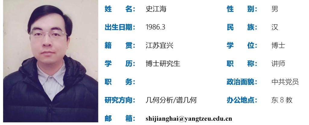 史江海,男,博士,讲师,主要研究方向为几何分析、谱几何。2018年6月毕业于武汉大学数学与统计公司;主持湖北省教育厅科学技术研究计划重点项目1项;发表学术论文8篇;获得英国上市公司官网365教学质量优秀奖1项。